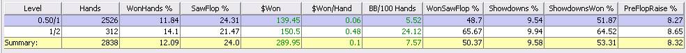 Der fing an wie gehabt. An 4 Tabels 1/2 hab ich erstmal konsequent keinen, aber wirklich KEINEN Flop getroffen. So sackte ich langsam immer bedenklicher ins Minus. Dann kam noch ein phänomenaler BadBeat, als so ne Schwanzlose Transe meinen geflopten Nutsflush mit einem Runner-Runner-Straightflush catscht. Zum Glück hab ich im letzten Orbit noch ein paar Pötte holen können und hatte nach einer Stunde nur 10BB Minus gemacht.